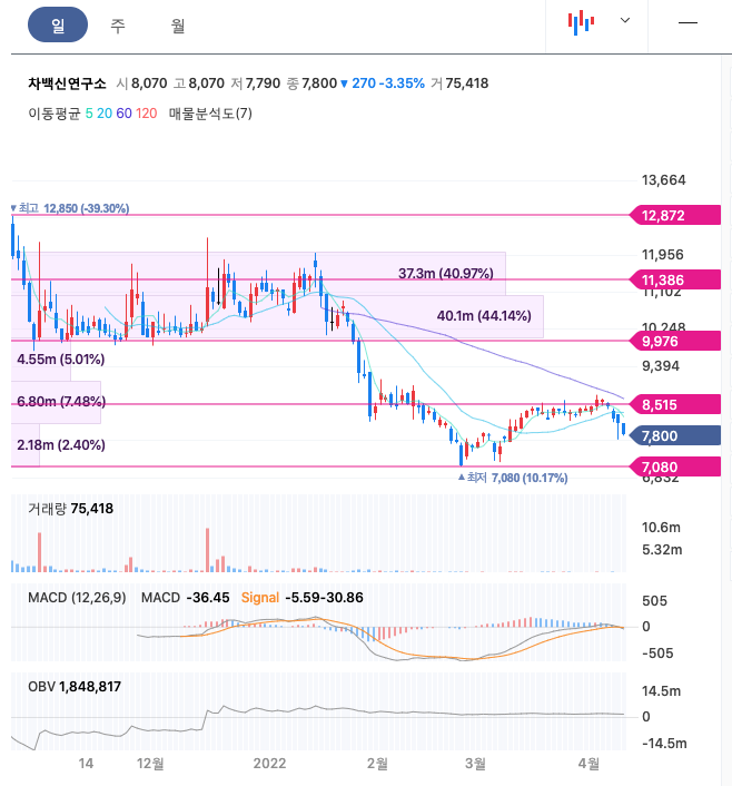 차백신연구소의 주가는 21년 10월 최고 12,850원에서 시작하여 조정을 받았습니다.