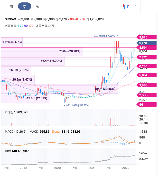 SIMPAC의 주가는 21년 6월 증가하여 21년 8월 최고 9870원을 찍고 조정을 받은 뒤 다시 반등하였습니다.