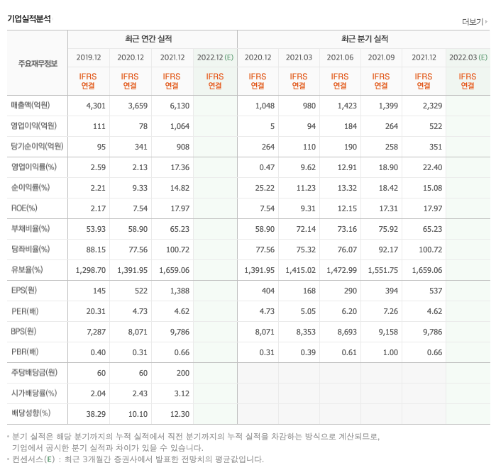 영업이익 : 2018년 102억원, 2019년 111억원, 2020년 78억원, 2021년 1064억원으로 전년동기대비 증가하였습니다. 2021년는 전년동기대비 1266.3% 하였습니다. 2021년 분기별로 보면 1분기 94억원, 2분기 184억원, 3분기 264억원, 4분기 522억원입니다.