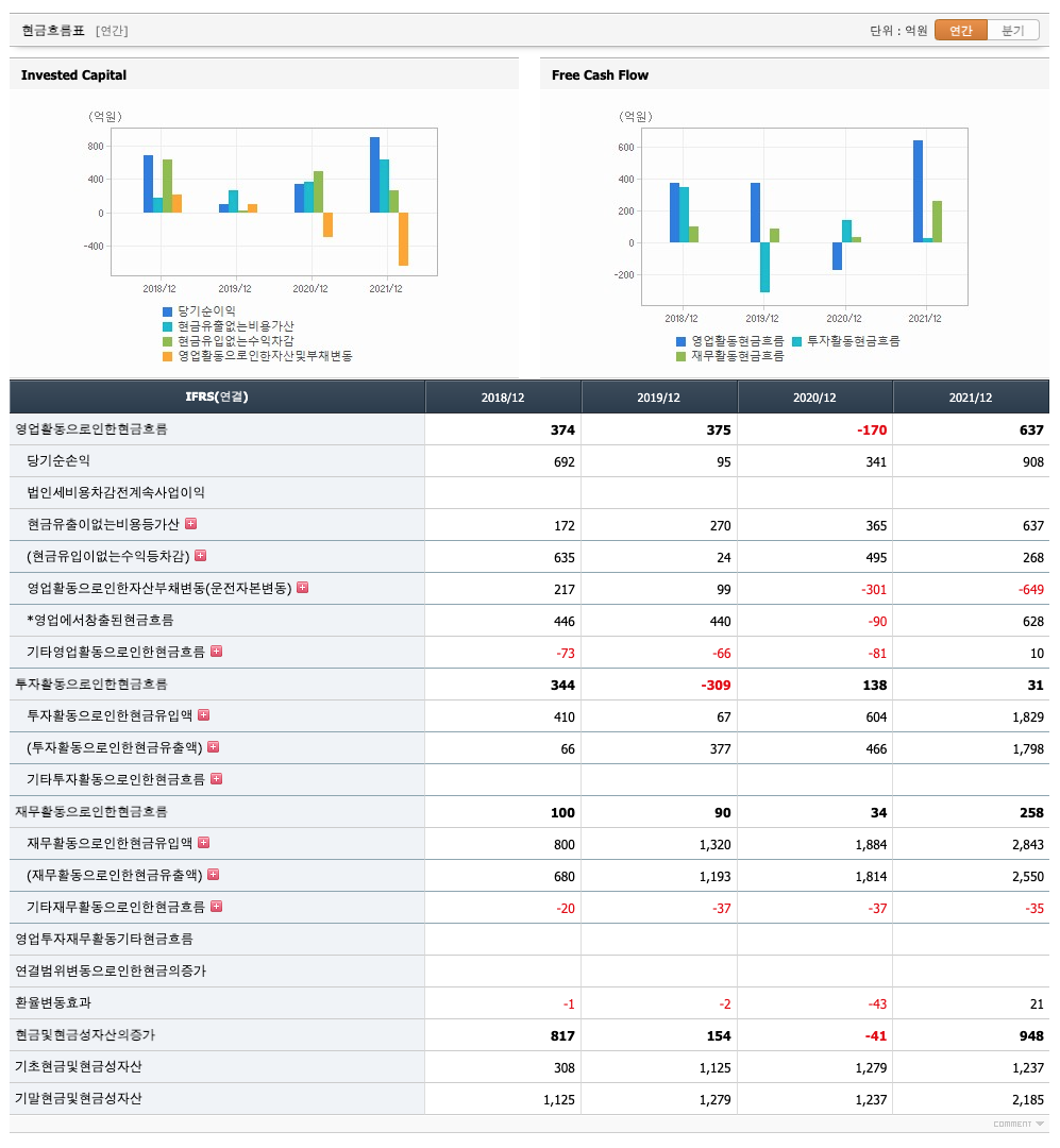 영업활동 현금흐름 : 2018년 374억원, 2019년 375억원, 2020년 -170억원, 2021년 637억원으로 2018년과 2019년과 2021년의 영업활동 현금흐름이 원활합니다.