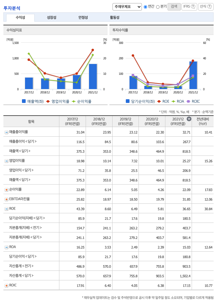 ROE(Return On Equity, 자기자본순이익율, 주주의 관점) : 2017년 약 43%, 2018년 약 8%, 2019년 약 6%, 2020년 약 5%, 2021년 약 36%이고, 자기자본순이익율은 이상율(10%)보다 높습니다.