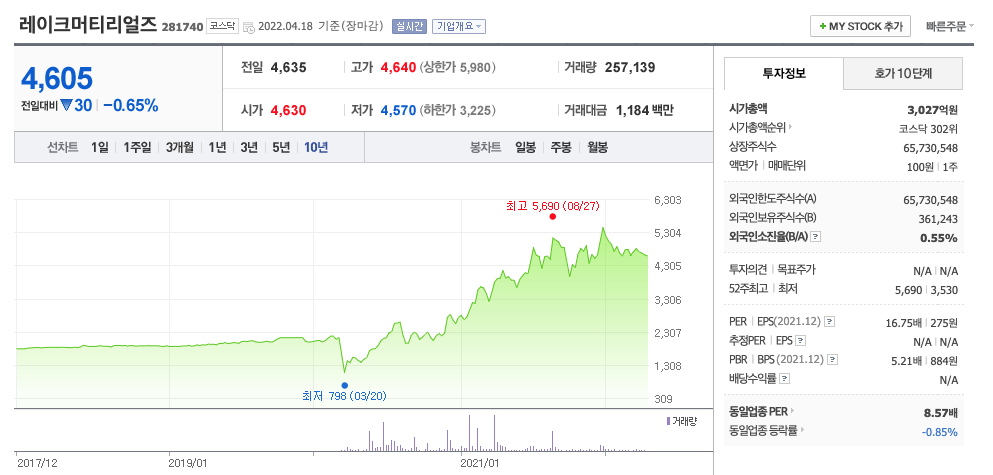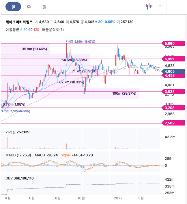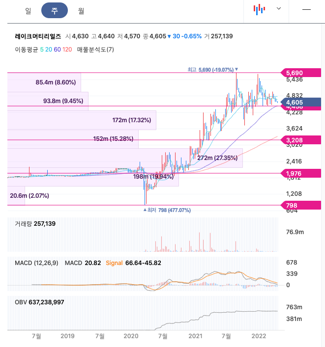레이크머티리얼즈의 주가는 21년 6월 반등하여 21년 8월 최고 5,690원을 찍고 조정을 받은 뒤 보합중에 있습니다.