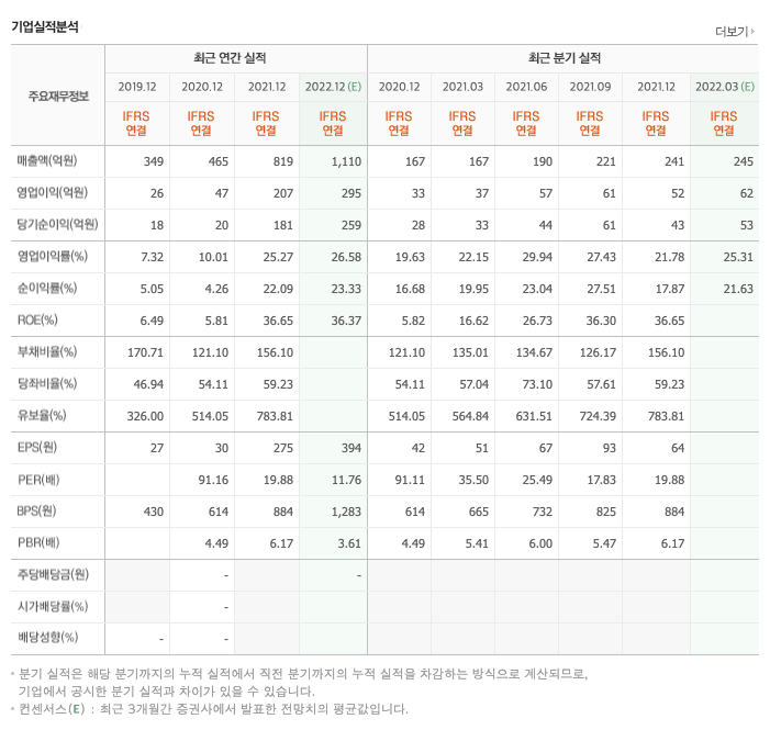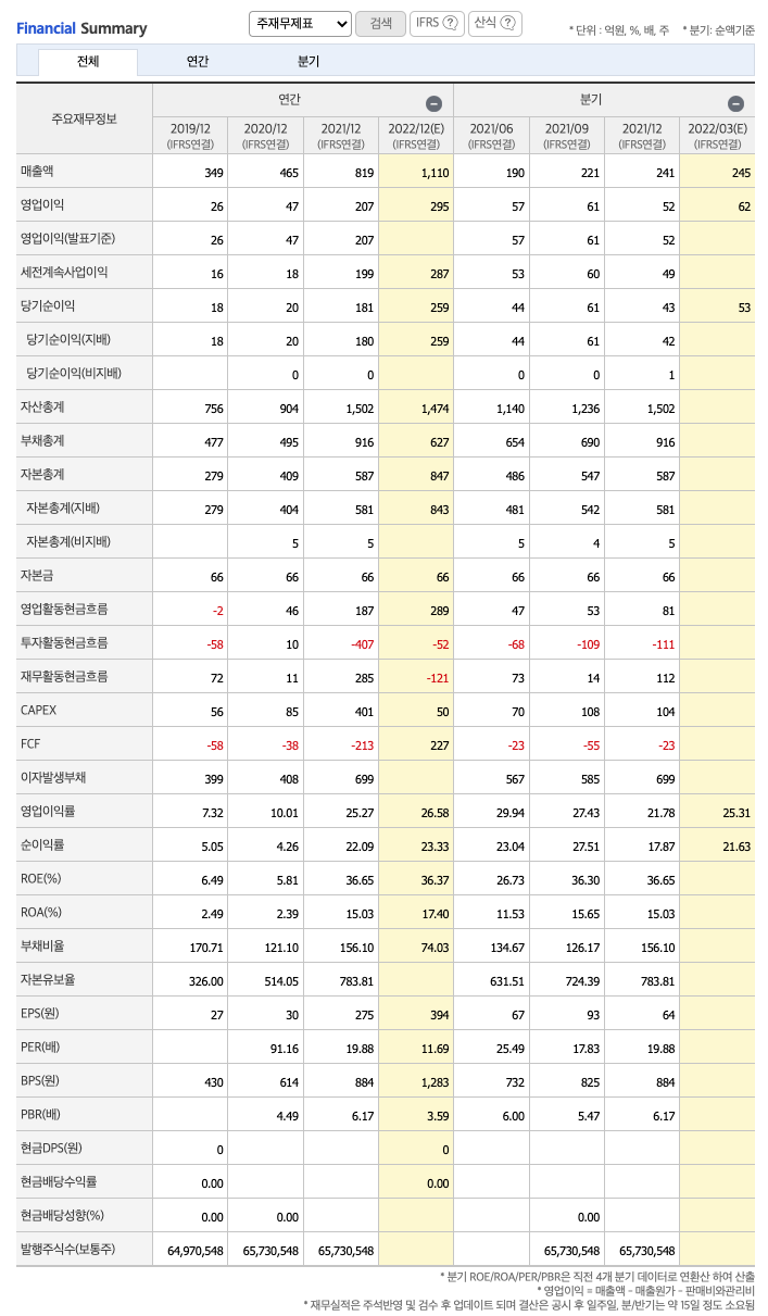 CAPEX(Capital expenditures,자본적 지출,미래의 이윤을 창출하기 위해 지출한 비용을 말함) : 2019년 56억원, 2020년 85억원, 2021년 401억원으로 CAPEX가 좋습니다. 2022년은 50억원으로 추정됩니다.