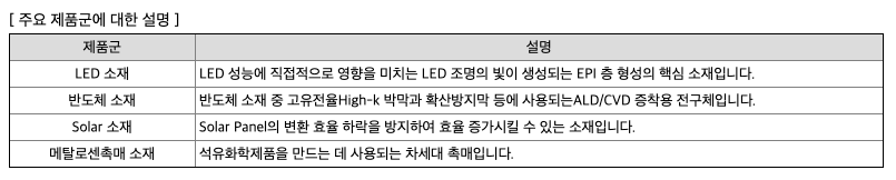 당사는 유기금속화학물 설계 및 TMA 제조기술 기반으로 하여 LED, 메탈로센촉매, 디스플레이, Solar, 반도체 등의 소재로 사용되는 초고순도 유기금속 화합물을 개발 및 공급하는 유기금속 화합물 전문 회사 입니다. 당사는 소재전문기업(산업통상자원부장관 확인)으로 국내 최초로 TMA를 개발하여 국산화한 기술력을 보유하고 있습니다. 2010년 "Global 최고의 소재기업으로 성장”이라는 사업비전을 가지고 일부 해외기업에 의존하던 LED용 소재의 국산화를 목표로 설립하였으며 이후 반도체, 디스플레이, Solar 소재 및 석유화학촉매를 자체 기술로 개발 소재 국산화를 주도하고 있습니다. 또한. LED, 반도체, 디스플레이, Solar소재 및 석유화학 촉매로 이어지는 안정적인 사업 포트폴리오를 갖추고 있으며, 독보적인 기술력을 바탕으로 설계, 합성, 정제 등 일괄 생산 공정을 구축하여 반도체, LED, Solar, 촉매시장의 빠른 변화에 효과적으로 개발 및 양산을 진행하여 초고순도 제품공급을 통해 Global 기업과 공동 개발 프로젝트를 수행할수 있는 공신력과 기술력을 보유하고 있습니다.