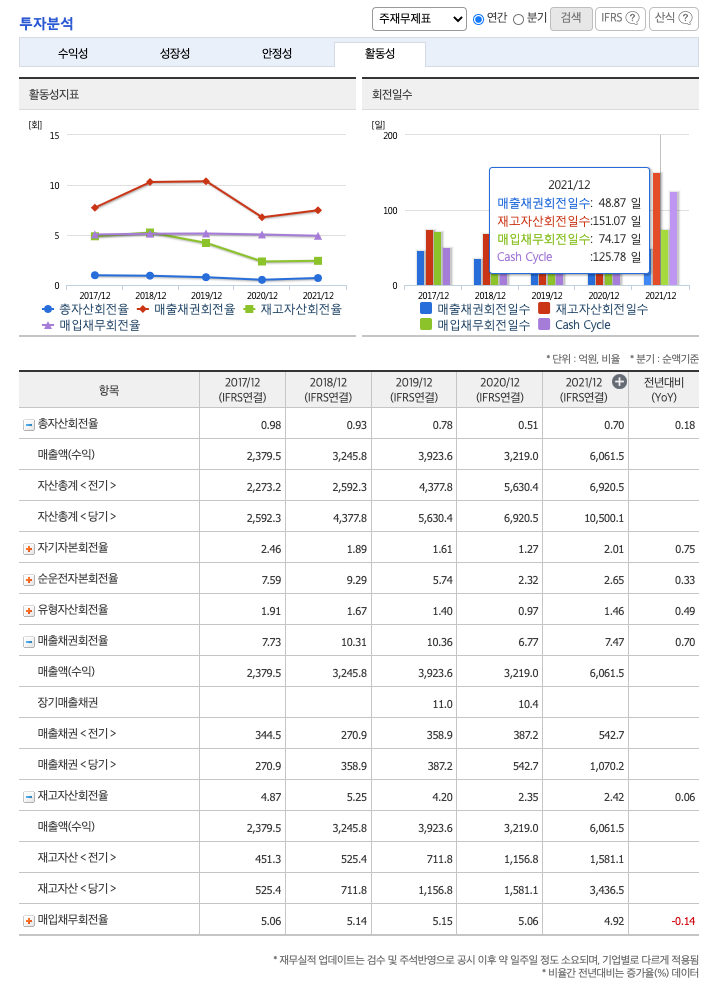 재고자산회전율(높을 수록 좋습니다) : 2019년 약 1156억원, 2020년 약 1581억원, 2021년 약 3436억원이고, 회전율은 2019년 약 4%, 2020년 약 2%, 2021년 약 2%로 안정적입니다.