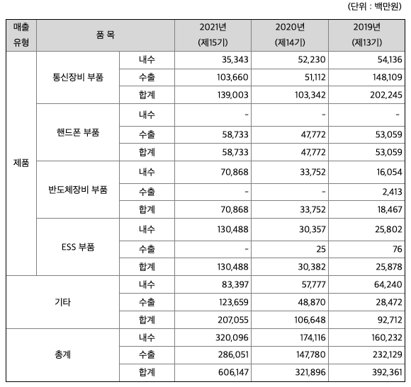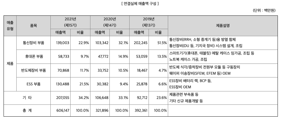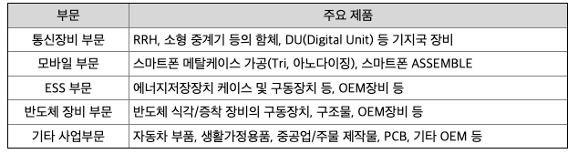 당사는 주요 전방산업별로 크게 통신장비 부문, 모바일 부문, ESS 부문, 반도체 장비부문의 4개 사업부문으로 구분되며, 기타 사업부문 두고 향후 회사의 신성장동력이 될 수 있는 사업들을 지속 발굴하고 있습니다.