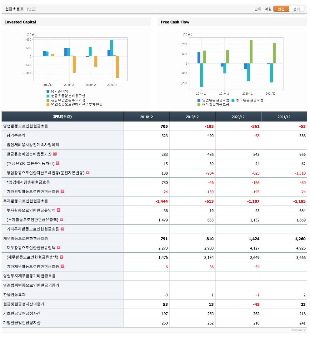 영업활동 현금흐름 : 2018년 705억원, 2019년 -185억원, 2020년 -361억원, 2021년 -53억원으로 2018년의 영업활동 현금흐름이 원활합니다.