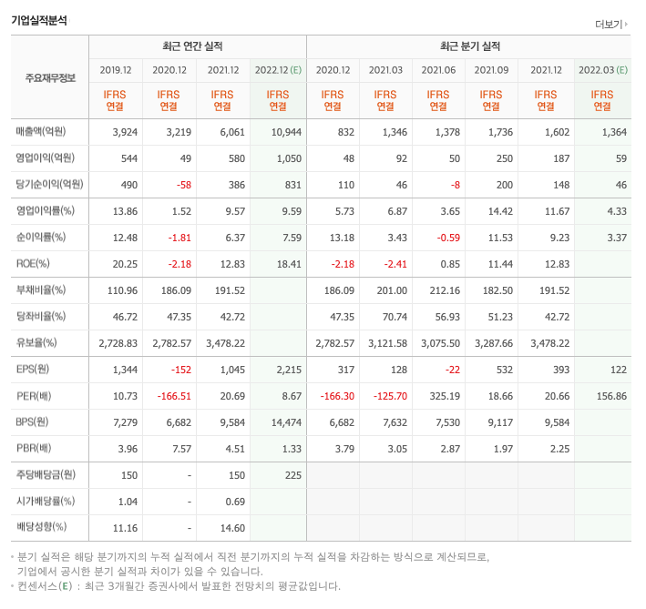 FCF(미래현금흐름) : 2019년 -809억원, 2020년 -1465억원, 2021년 -1256억원으로 CAPEX가 좋지 않습니다. 2022년은 20억원으로 추정됩니다.