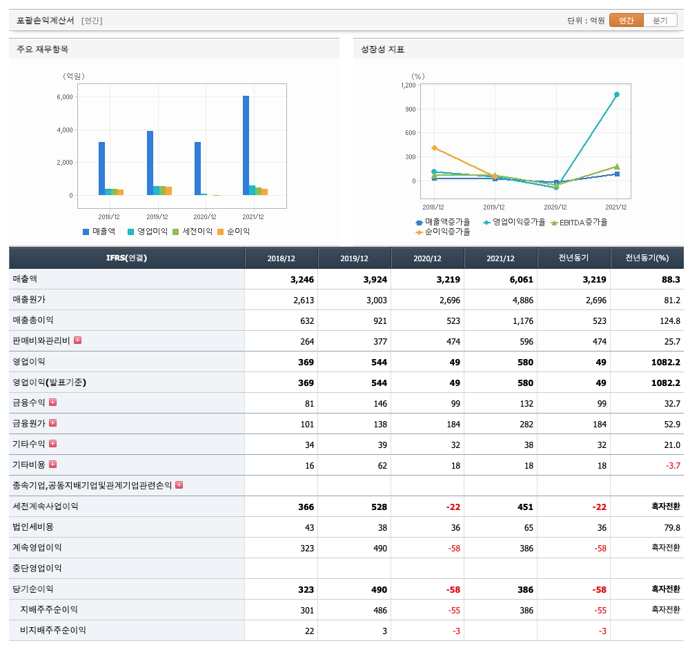 매출액 : 2018년 3246억원, 2019년 3924억원, 2020년 3219억원, 2021년 6061억원으로 전년동기대비 증가하였습니다. 2021년는 전년동기대비 88.3% 증가하였습니다. 2021년 분기별로 보면 1분기 1346억원, 2분기 1378억원, 3분기 1736억원, 4분기 1602억원입니다.