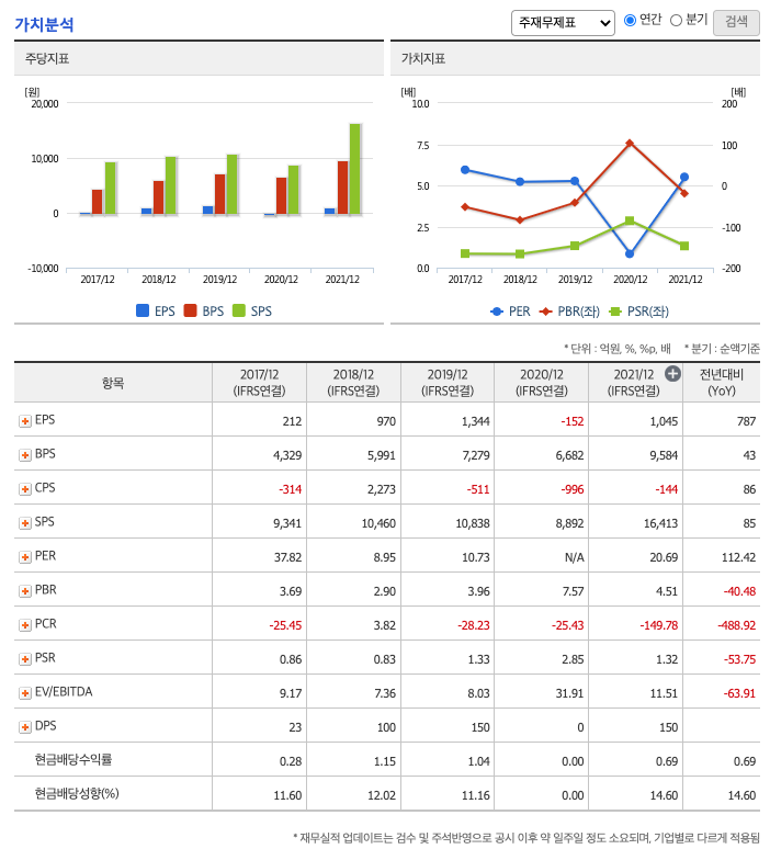 DPS(Dividend Per Share의 약자, 총배당금을 총주식발생수로 나눈 것, 한 주당 얼만큼의 배당금을 받을 수 있는지 알 수 있는 지표, DPS가 높을 수록 배당금이 많은 것임) : 2017년 23원, 2018년 100원, 2019년 150원, 2020년 0원, 2021년 150원으로 전년동기 증가하였습니다.