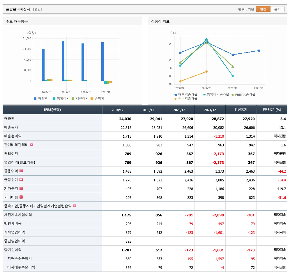 매출액 : 2018년 24,030억원, 2019년 29,941억원, 2020년 27,920억원, 2021년 28,872억원으로 전년동기대비 증가하였습니다. 2021년는 전년동기대비 3.4% 증가하였습니다. 2021년 분기별로 보면 1분기 6847억원, 2분기 7227억원, 3분기 6194억원, 4분기 8605억원입니다.