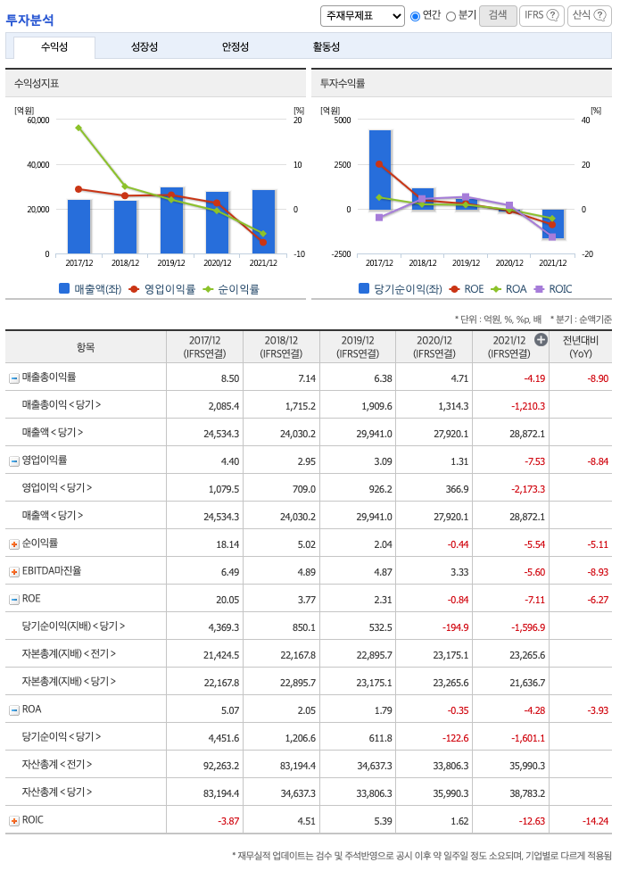 ROA(Return On Assets, 총자산순이익율, 경영자의 관점) : 2017년 약 5%, 2018년 약 2%, 2019년 약 1.79%, 2020년 약 -0.35%, 2021년 약 -4.28%이고, 자기자본순이익율은 이상율(10%)보다 낮습니다.