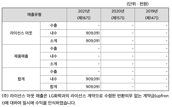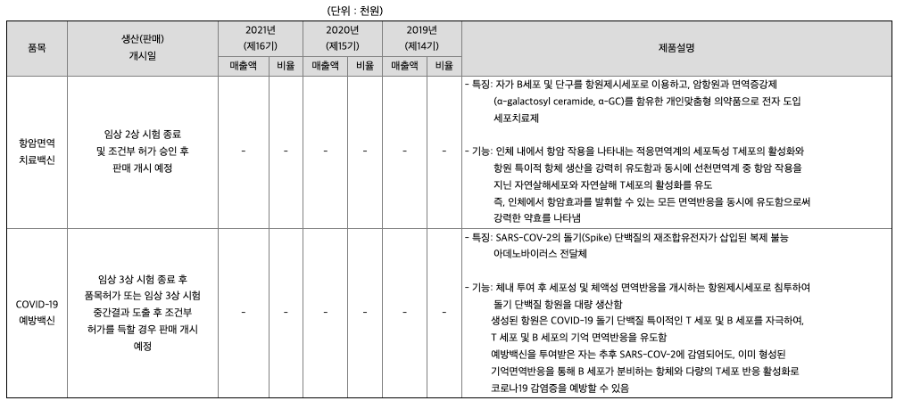 당사는 2020년 11월 30일 백신&세포유전자치료제 GMP센터를 완공하였으며, 당사 제품의 임상 단계에 필요한 생산과 향후 GMP 인증 후 시판 예정인 제품의 생산능력을 보유하고 있습니다. CeliVax 기반기술을 활용한 5종의 항암면역치료백신 파이프라인과 COVID-19 예방백신을 개발 중이며 현재 비임상 또는 임상 단계의 연구 중으로 시판 중인 제품은 없습니다. 따라서, 판매조직은 구성되어 있지 않습니다. 2021년 상반기 중 Neo-Antigen 유래 암항원을 포함/탑재하는 완전 개인맞춤형 항암면역치료백신과 관련된 기술 및 특허를 전 세계에서 실시할 수 있는 독점배타적 전용 실시권과 제3자에 대한 재실시권을 LG화학에 기술이전하고 계약금을 수령하였습니다.