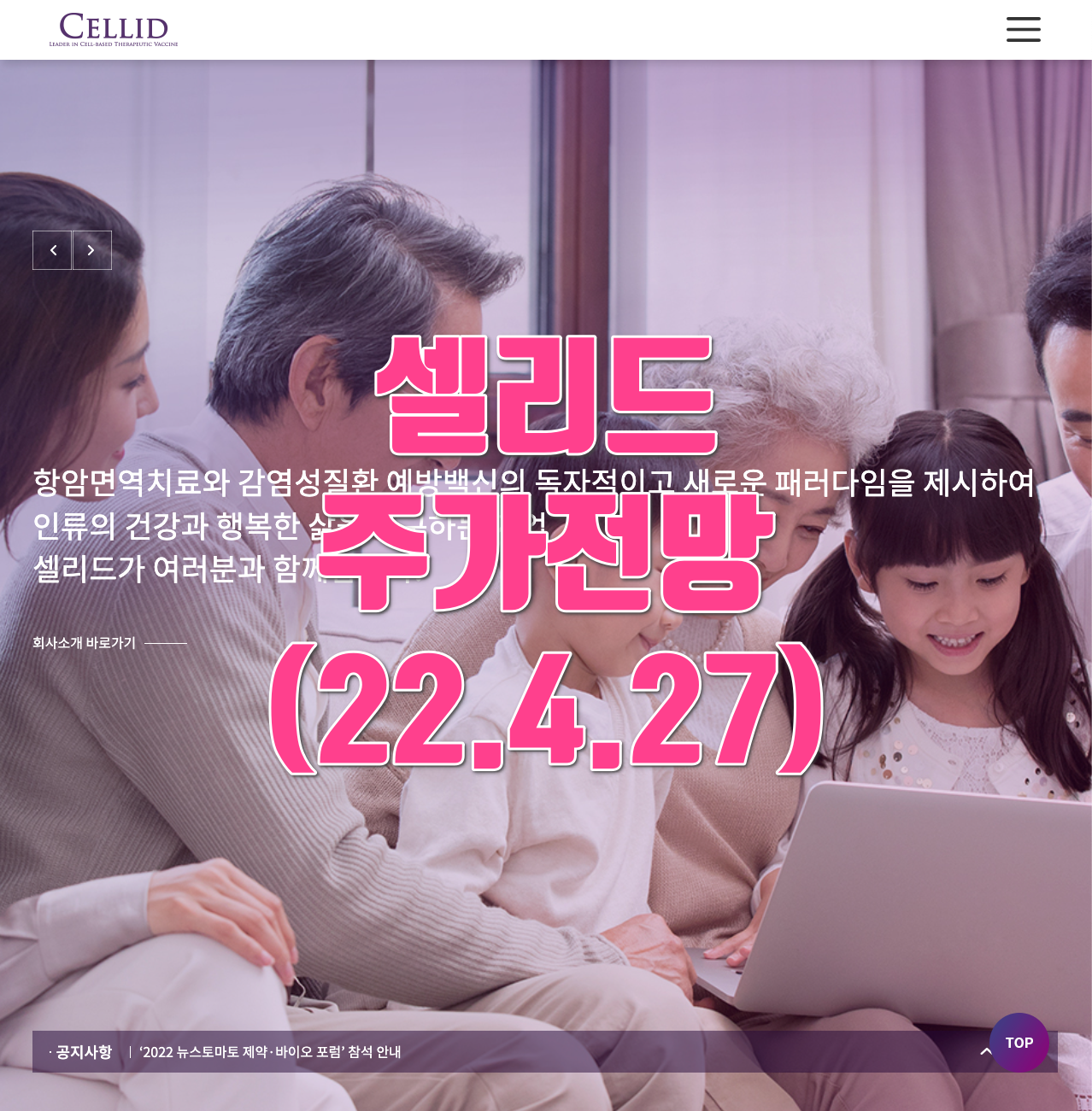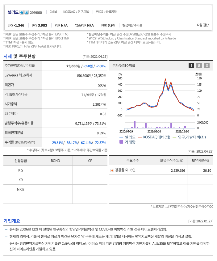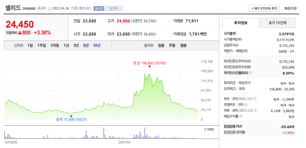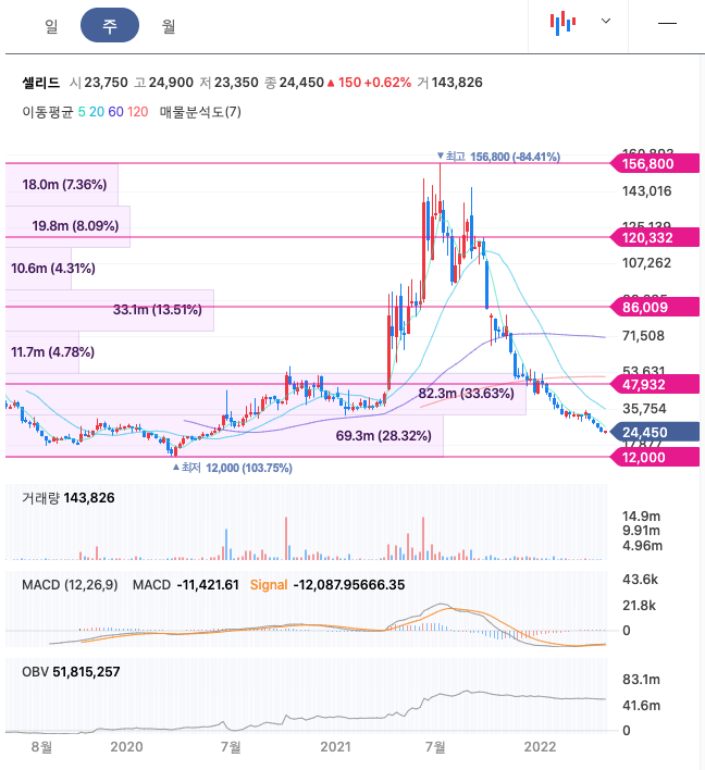 셀리드의 주가는 21년 4월 급등하여 21년 7월 최고 156,800원을 찍고 조정을 받았습니다.