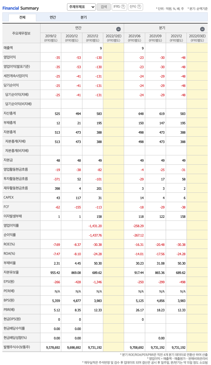매출액 : 2021년 9억원입니다. 2021년 분기별로 보면 2분기 6억원입니다.
