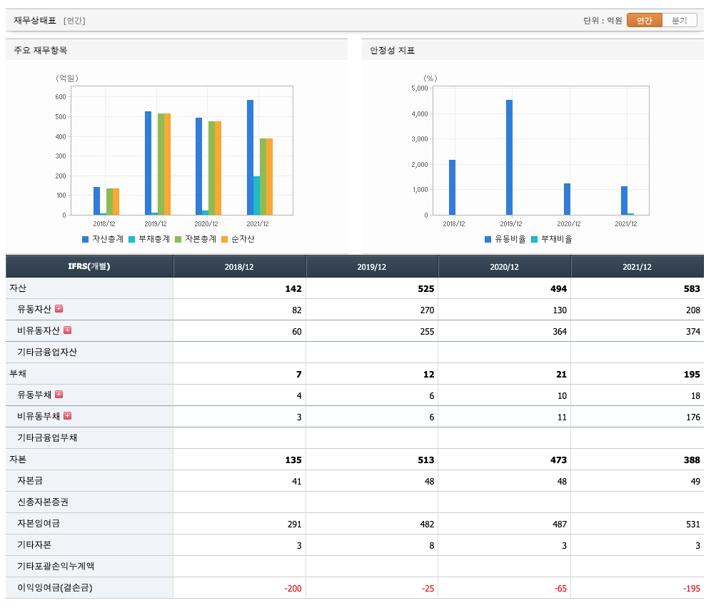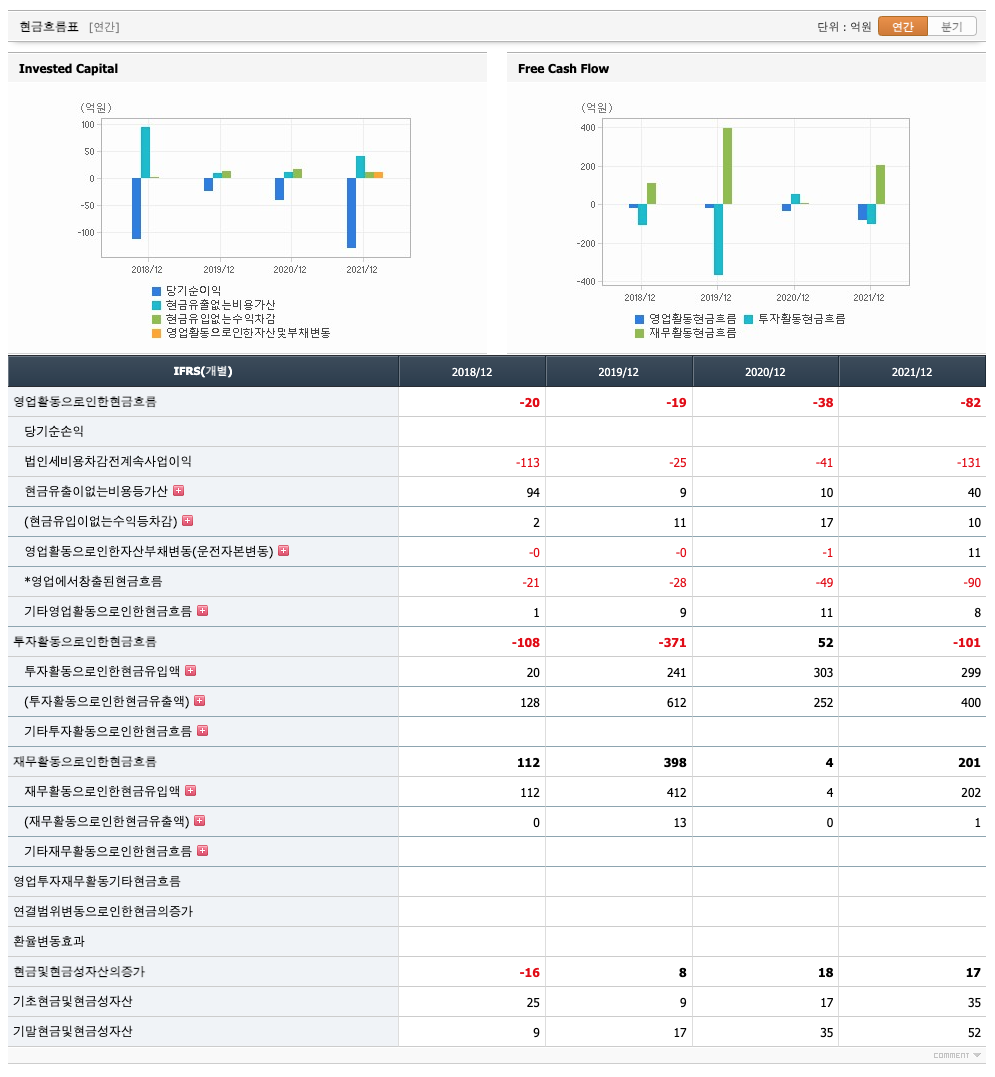 FCF(미래현금흐름) : 2019년 -62억원, 2020년 -155억원, 2021년 -133억원으로 CAPEX가 좋습니다.