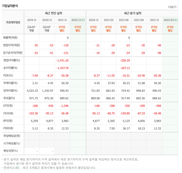 영업이익 : 2018년 -24억원, 2019년 -35억원, 2020년 -53억원, 2021년 -130억원으로 전년동기대비 적자지속하였습니다. 2021년 분기별로 보면 1분기 -28억원, 2분기 -23억원, 3분기 -30억원, 4분기 -48억원입니다.