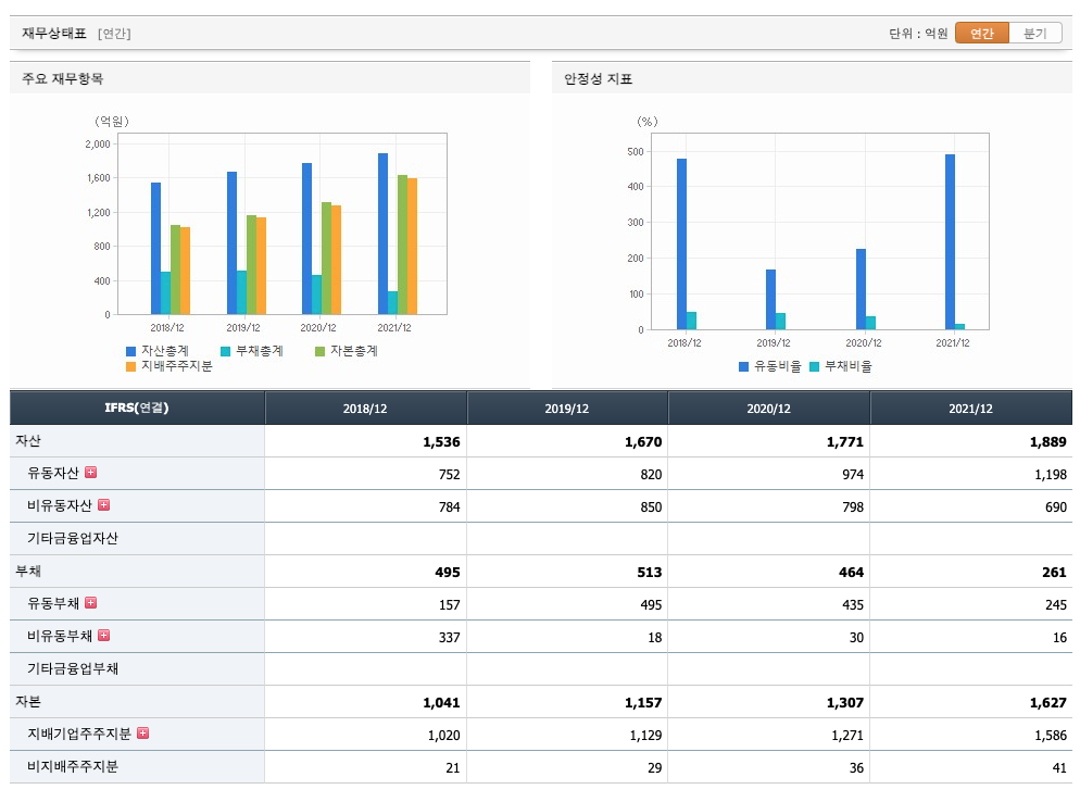 부채비율 : 2019년 약 44%, 2020년 약 35%, 2021년 약 16%로 감소하고 있으며, 표준(100%)보다 낮아 부채비율이 안정적입니다.