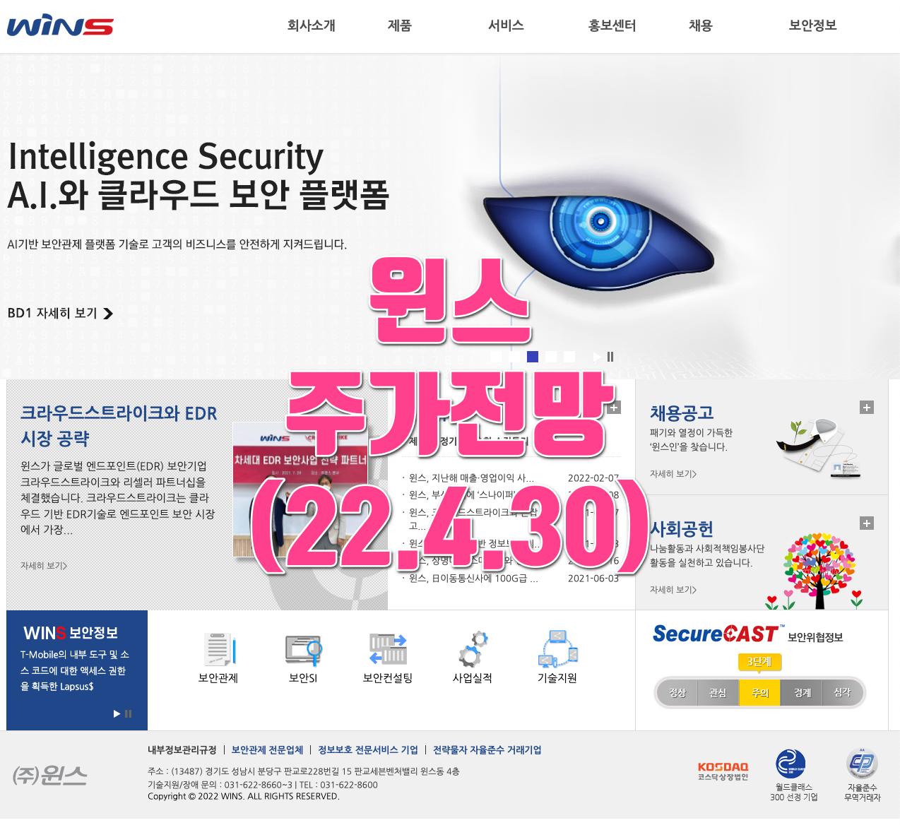 윈스의 2022년 영업이익은 235억원으로 추정됩니다. 현재(22. 4. 30 ) 시가총액은 2348억원으로 멀티플 9입니다.