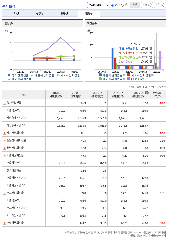 재고자산회전율(높을 수록 좋습니다) : 2019년 약 97억원, 2020년 약 76억원, 2021년 약 77억원이고, 회전율은 2019년 약 8%, 2020년 약 10%, 2021년 약 12%로 안정적입니다.