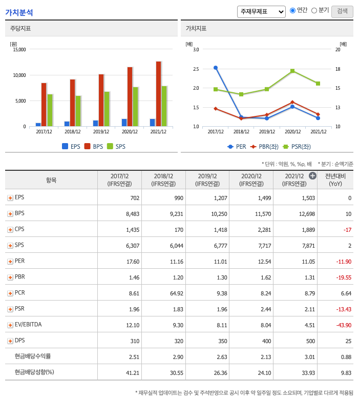 DPS(Dividend Per Share의 약자, 총배당금을 총주식발생수로 나눈 것, 한 주당 얼만큼의 배당금을 받을 수 있는지 알 수 있는 지표, DPS가 높을 수록 배당금이 많은 것임) : 2017년 310원, 2018년 320원, 2019년 350원, 2020년 400원, 2021년 500원으로 전년동기 증가하였습니다.