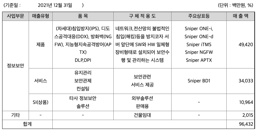 당사와 연결종속회사(이하 연결실체)는 네트워크보안 제품 제조 및 보안서비스 제공등 정보보안부문이 전체 매출의 90% 이상 차지하는 관계로 연결실체별 별도의 사업의 내용은 작성치 않습니다.