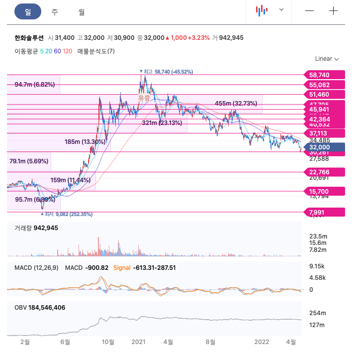 한화솔루션의 주가는 21년 1월 최고 58,740원을 찍고 조정을 받았습니다.