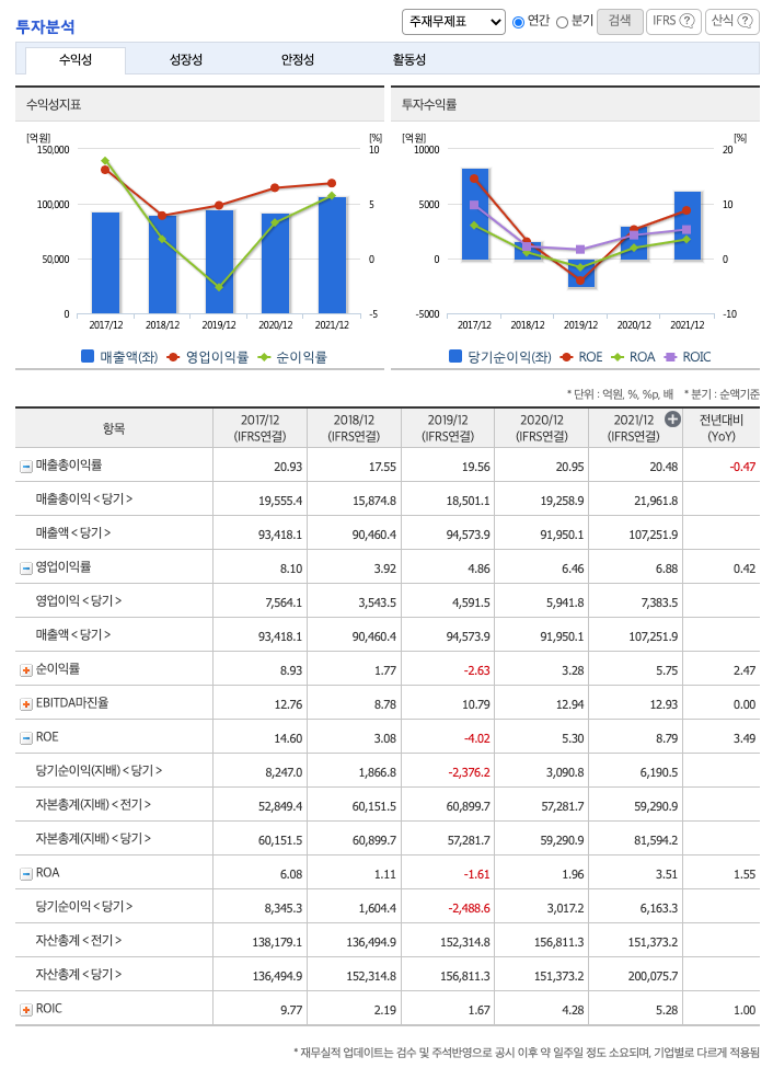 ROA(Return On Assets, 총자산순이익율, 경영자의 관점) : 2017년 약 6%, 2018년 약 1% , 2019년 약 -1%, 2020년 약 1%, 2021년 약 3%이고, 자기자본순이익율은 이상율(10%)보다 낮습니다.