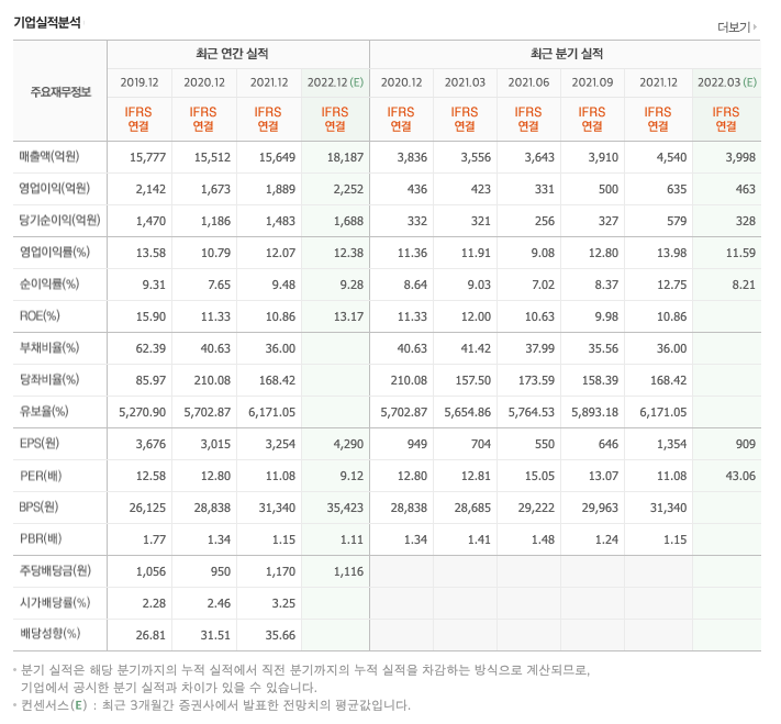 DPS(Dividend Per Share의 약자, 총배당금을 총주식발생수로 나눈 것, 한 주당 얼만큼의 배당금을 받을 수 있는지 알 수 있는 지표, DPS가 높을 수록 배당금이 많은 것임) : 2017년 1245원, 2018년 1278원, 2019년 1056원, 2020년 950원, 2021년 1170원으로 전년동기 증가하였습니다.