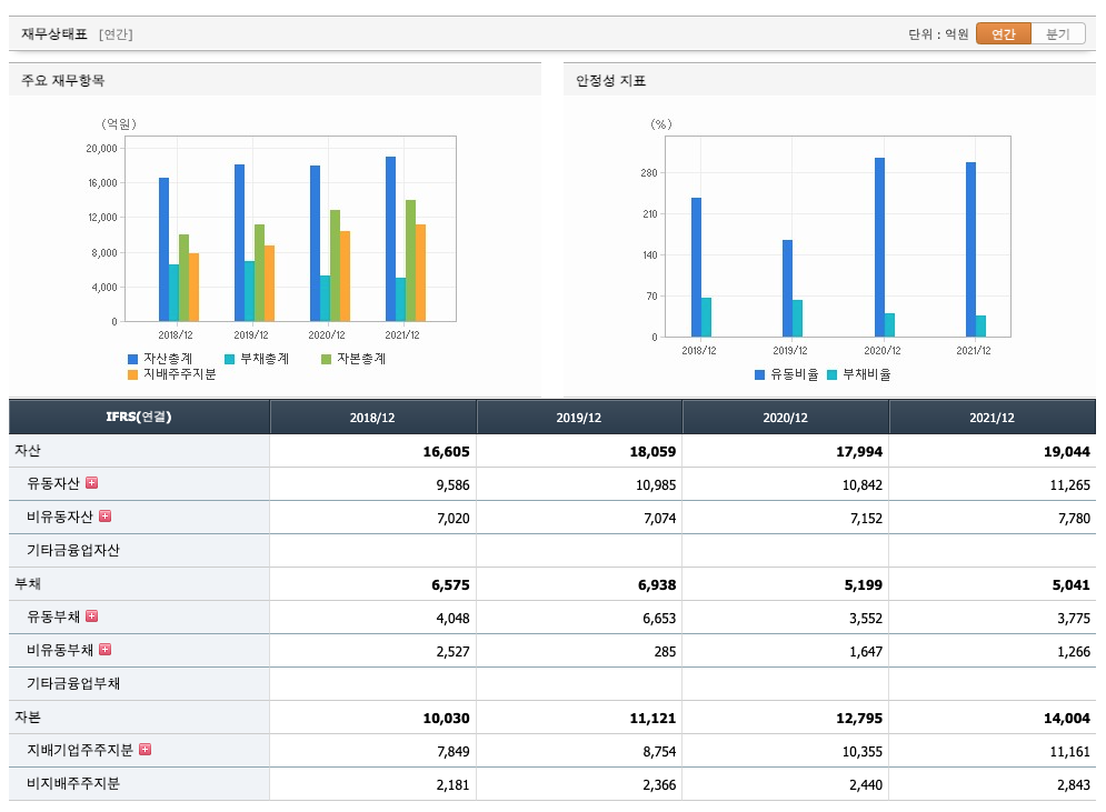 부채비율 : 2019년 약 62%, 2020년 약 40%, 2021년 약 36%로 감소하고 있으며, 표준(100%)보다 낮아 부채비율이 안정적입니다.