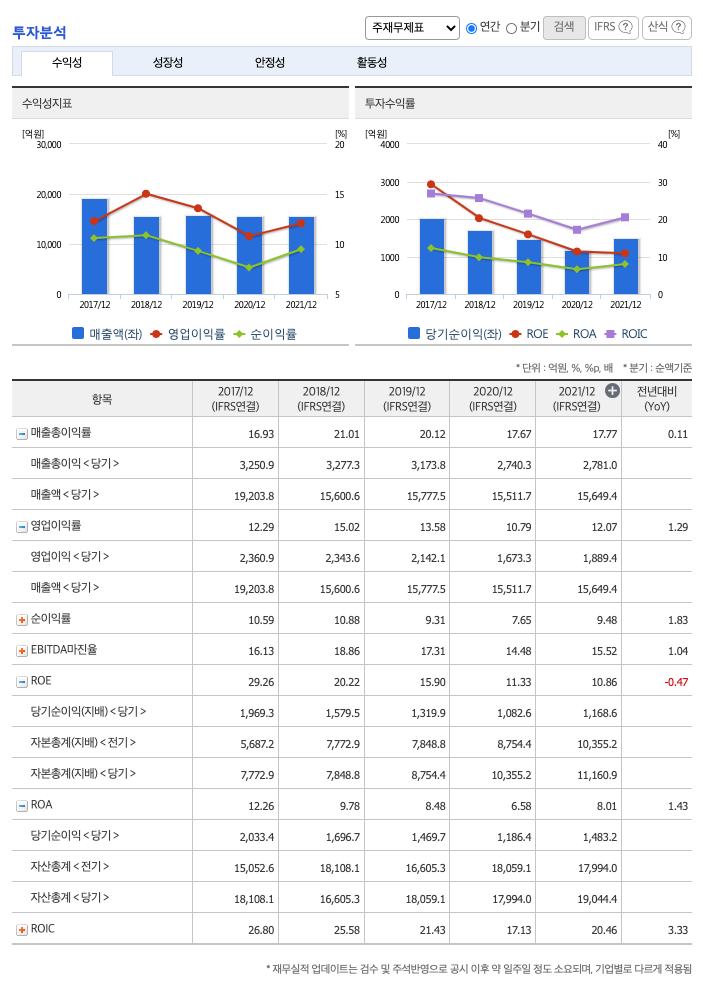 ROA(Return On Assets, 총자산순이익율, 경영자의 관점) : 2017년 약 12%, 2018년 약 9%, 2019년 약 8%, 2020년 약 6%, 2021년 약 8%이고, 자기자본순이익율은 이상율(10%)보다 낮습니다.