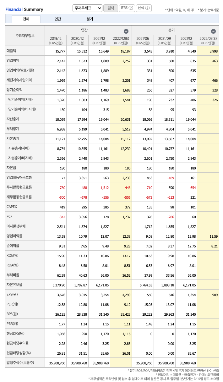 FCF(미래현금흐름) : 2019년 -342억원, 2020년 3056억원, 2021년 178억원으로 CAPEX가 좋습니다. 2022년은 1737억원으로 추정됩니다.