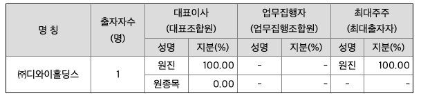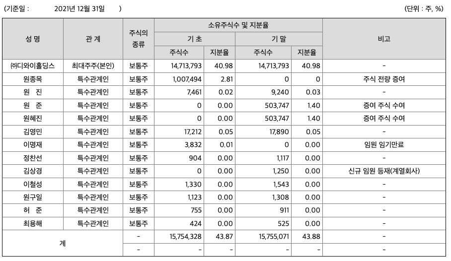 당사의 최대주주는 ㈜디와이홀딩스이며, 그 지분율은 40.98%로서 특수관계인을 포함하면 43.88%입니다.
