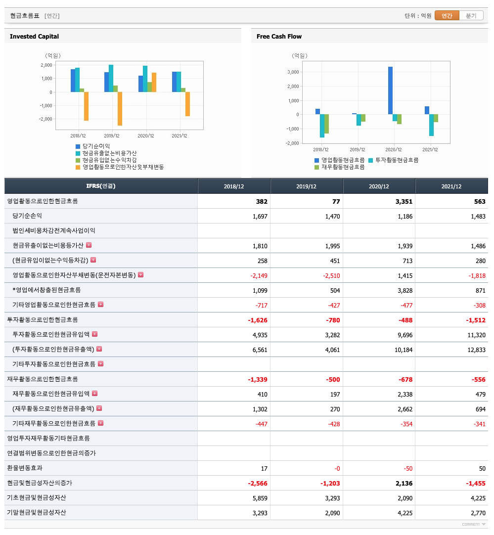 영업활동 현금흐름 : 2018년 382억원, 2019년 77억원, 2020년 3351억원, 2021년 563억원으로 영업활동 현금흐름이 원활합니다.