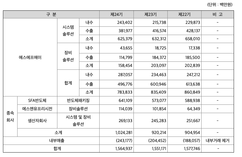 당사 및 연결종속회사는 스마트팩토리솔루션사업과 반도체패키징사업을 주된 사업으로 영위하고 있습니다. 스마트팩토리솔루션사업은 당사, 에스엔유프리시젼 및 SFA반도체를 제외한 기타의 종속회사가 영위하고 있는 사업 부문으로서, 디스플레이, Glass, 2차전지, 반도체, 유통 산업 부문에서 필요로 하는 물류시스템 및 다양한 공정장비를 공급하고 있습니다.특히, 당사는 창립 이래부터 국내외 디스플레이산업의 발전과 궤를 같이하며, 디스플레이 제조 장비를 주력 사업으로 영위하며 성장하였습니다. 최근에는 제4차 산업혁명에 따른 스마트팩토리 확산 조류에 대비하여 자체적으로 개발한 스마트기술을 접목한 최첨단 스마트팩토리 장비를 기반으로 보다 더 큰 성장동력이 활성화되는 2차전지 및 유통, 장비시장 규모가 현격하게 큰 반도체 등의 비디스플레이산업부문으로 사업 영역을 확장하여 사업성과 안정성 등을 확보함은 물론 성장 동력도 확보하기 위한 노력을 기울이고 있습니다. 이러한 결과 당사는 2021년 전체 수주액 중 비디스플레이 비중이 70%에 달하는 실적을 도출하며 사업다각화의 기반을 확고하게 구축함으로써 2차전지, 반도체, 유통 등의 비디스플레이사업부문을 통한 충분한 성장잠재력을 확보하였습니다. 연결기준으로 스마트팩토리솔루션사업부문의 2021년 매출액은 9,243억원이며, 영업이익은 1,227억원입니다.