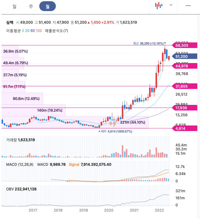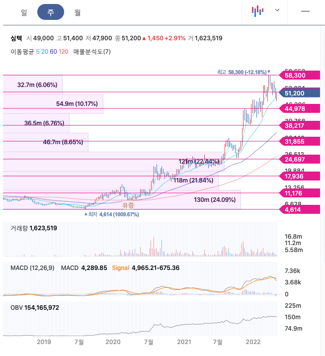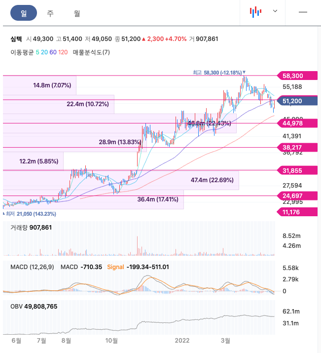 심텍의 주가는 21년 10월 증가하여 22년 3월 최고 58,300원을 찍고 조정을 받았습니다.