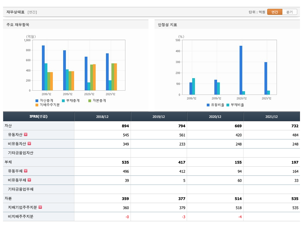 유보율 : 2019년 약 528%, 2020년 약 383%, 2021년 약 339%로 감소하고 있으며, 표준(100%)보다 낮아 유보율이 안정적이지 않습니다.