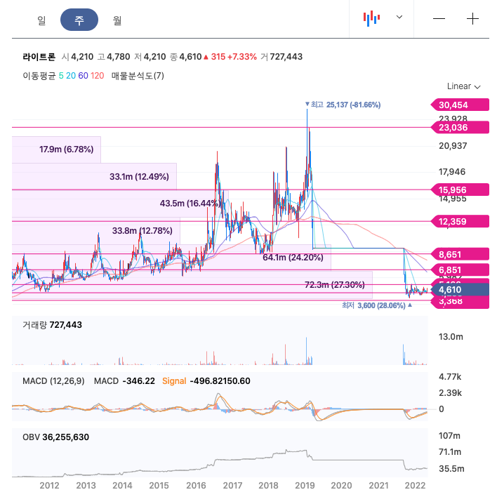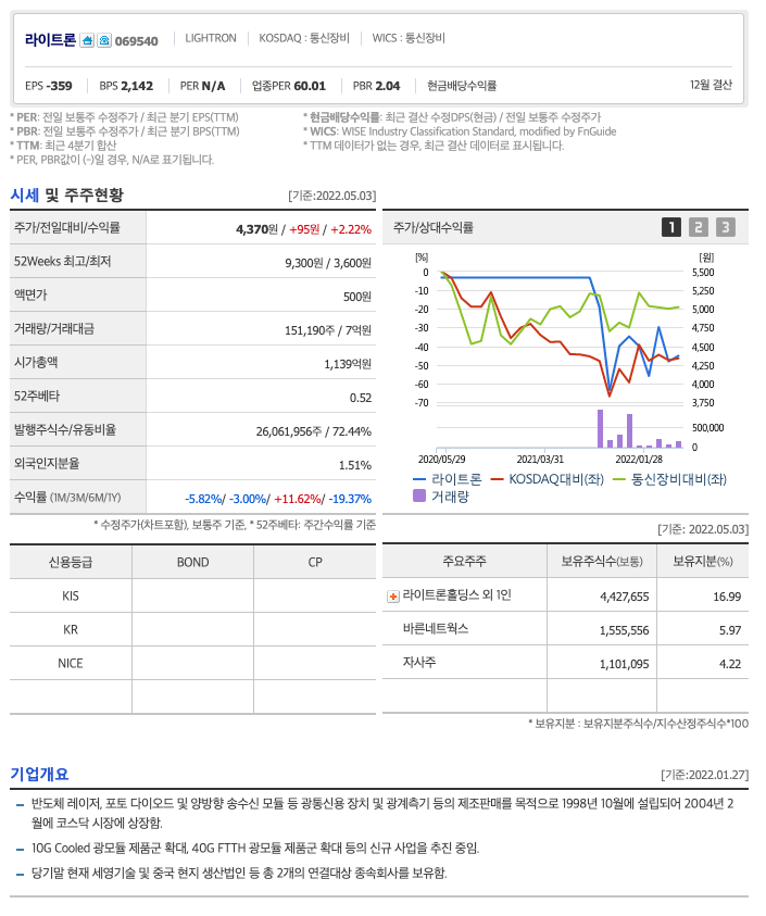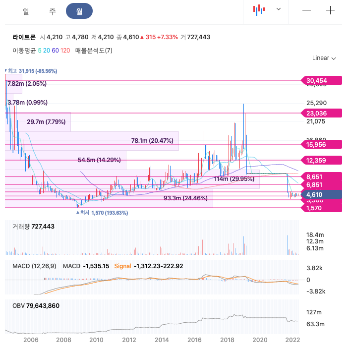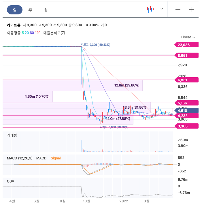 라이트론의 주가는 21년 9월부터 개장하여 급락한 이후, 보합중에 있습니다.