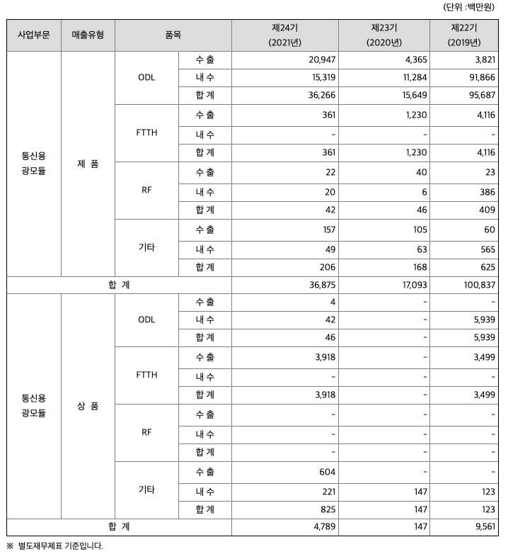 국내 5G 통신망 구축이 본격화한 2019년 1,104억원의 매출실적을 달성했으며, 2020년에는 코로나19 팬데믹의 영향으로 이동통신사업자의 5G 통신망 투자가 급감함에 따라 영업실적의 하락을 경험한 이후 2021년부터 국내 및 해외시장에서의 통신망 구축 투자가 재개되면서 국내 5G 가입자수 2,000만명을 돌파했고, 국내장비사들의 해외시장에서의 통신장비 공급계약 증가에 힘입어 당사의 매출과 이익도 증가세에 있습니다.