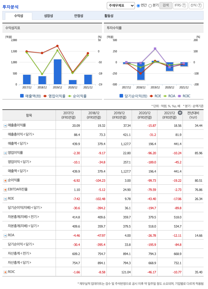 ROE(Return On Equity, 자기자본순이익율, 주주의 관점) : 2017년 약 -7%, 2018년 약 -102%, 2019년 약 9%, 2020년 약 -43%, 2021년 약 -17%이고, 자기자본순이익율은 이상율(10%)보다 낮습니다.