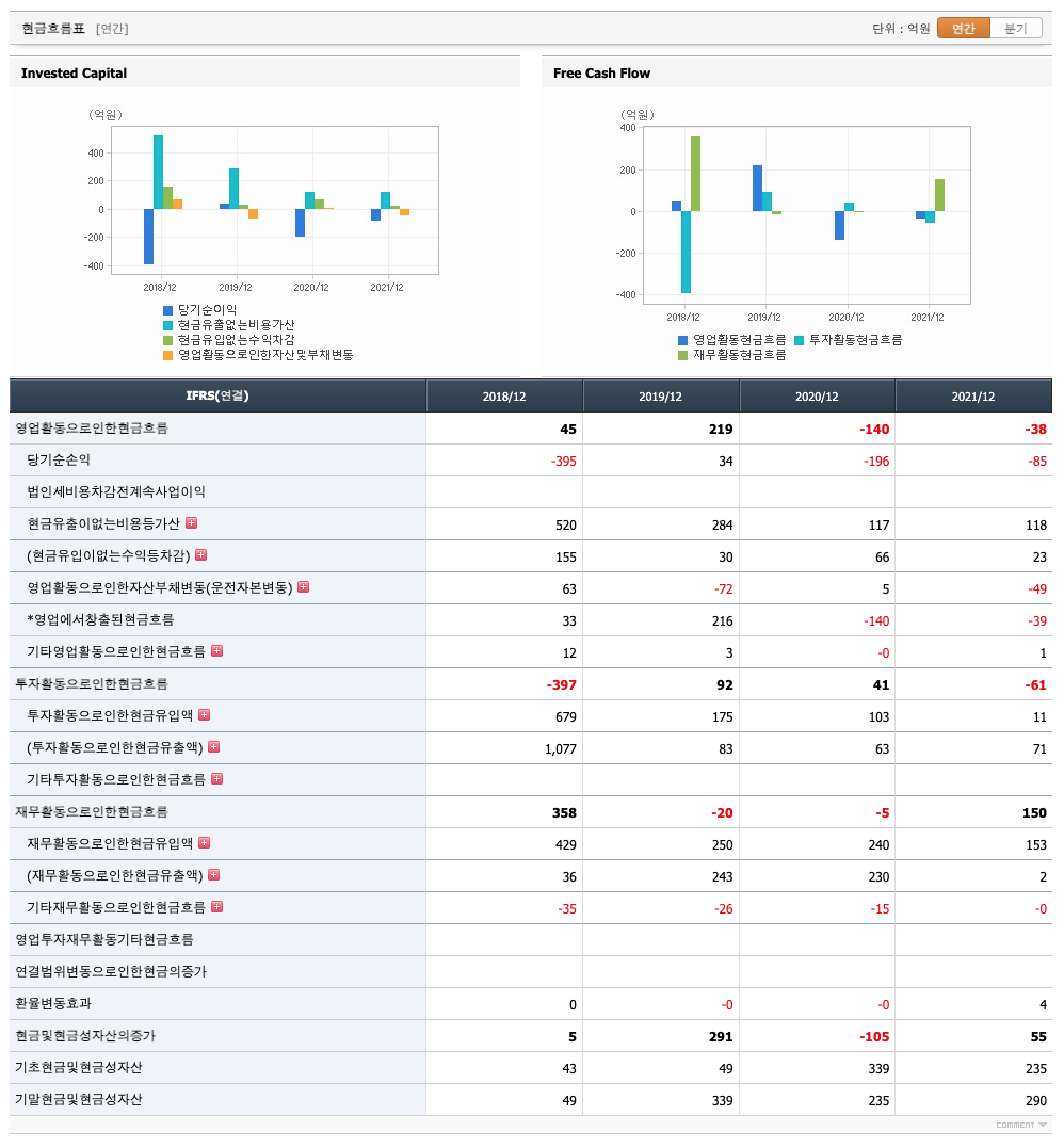 투자활동 현금흐름 : 2018년 -397억원, 2019년 92억원, 2020년 41억원, 2021년 -61억원으로 2018년과 2021년의 투자활동 현금흐름이 원활합니다.