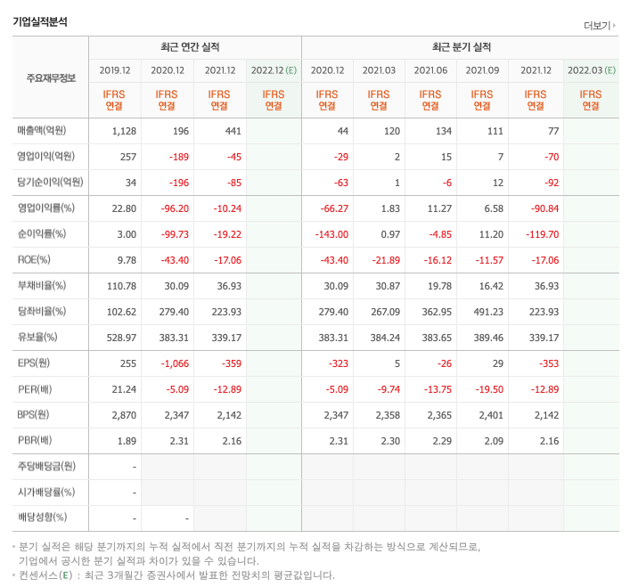 영업이익 : 2018년 -35억원, 2019년 257억원, 2020년 -189억원, 2021년 -45억원으로 전년동기대비 적자전환하였습니다. 2021년 분기별로 보면 1분기 2억원, 2분기 15억원, 3분기 7억원, 4분기 -70억원입니다.