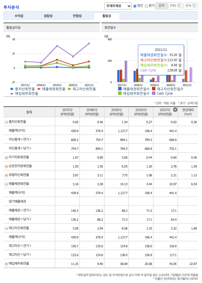 재고자산회전율(높을 수록 좋습니다) : 2019년 약 138억원, 2020년 약 156억원, 2021년 약 117억원이고, 회전율은 2019년 약 8%, 2020년 약 1%, 2021년 약 3%로 안정적입니다.