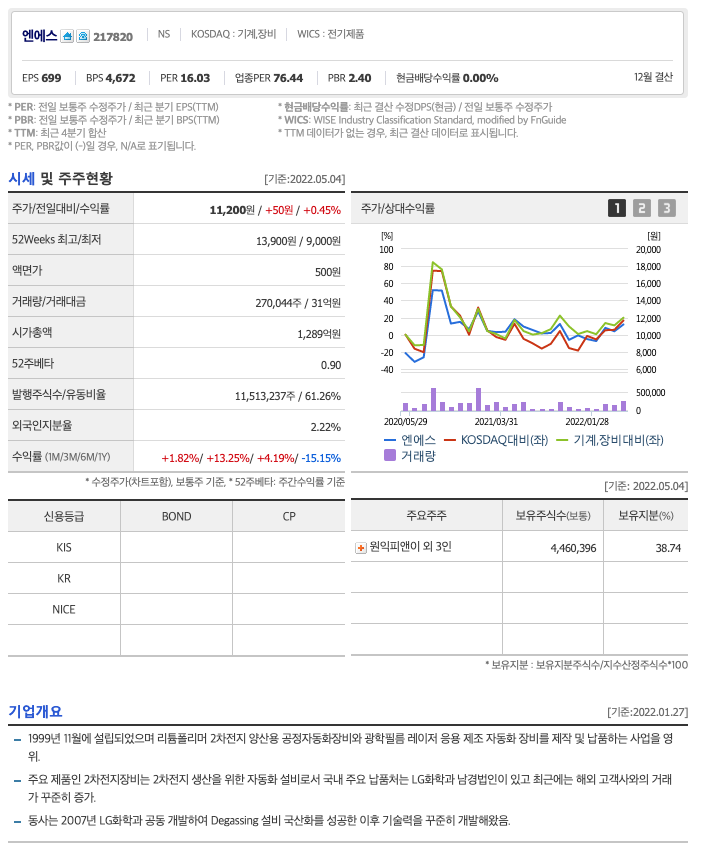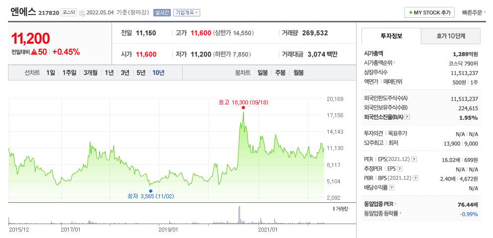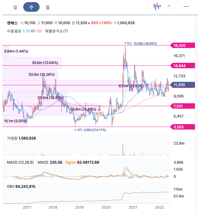 엔에스의 주가는 20년 8월 급등하여 20년 9월 최고 18,300원을 찍고 조정을 받은 후 보합상태에 있습니다.