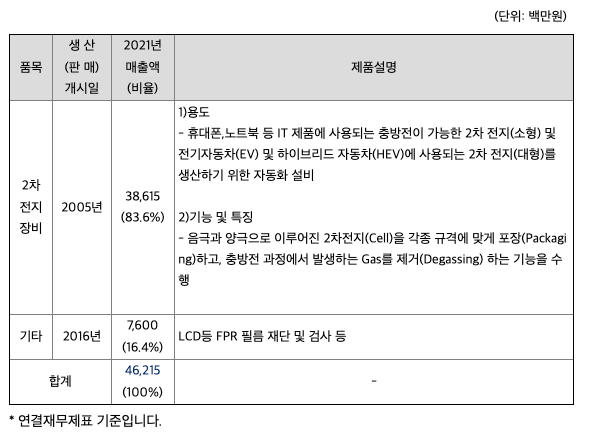 당사는 자동차용 2차 전지 및 산업용 2차 전지와 같은 중대형 리튬폴리머 2차 전지 생산라인 4개의 공정 중 ②조립공정(Packaging)과 ④디게싱 공정(degassing)을 위한 자동화설비를 제작 공급하고 있으며, 당사의 장비는 각 공정설비 중 개별 기계가 아닌 공정라인일체(Turn-key방식)를 수주 받아 제작납품하고 있습니다. 예를 들어, 조립공정(Packaging)이 10여개의 기계설비로 이루어져있다면 10여개 일체의 장비를 수주. 제작. 납품하고 있습니다.