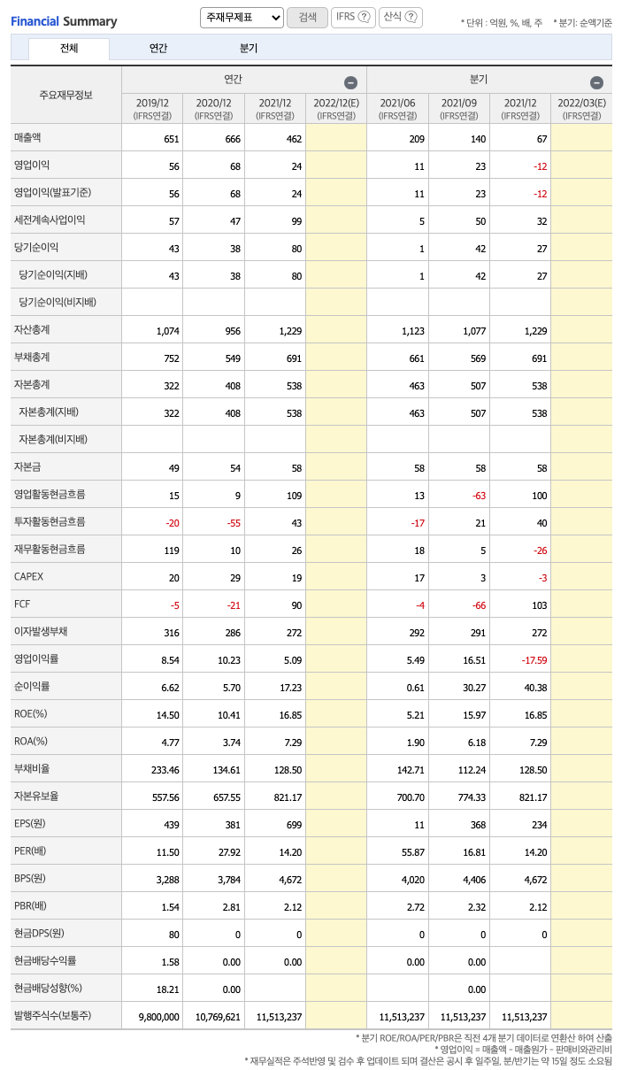 CAPEX(Capital expenditures,자본적 지출,미래의 이윤을 창출하기 위해 지출한 비용을 말함) : 2019년 20억원, 2020년 29억원, 2021년 19억원으로 CAPEX가 좋습니다.