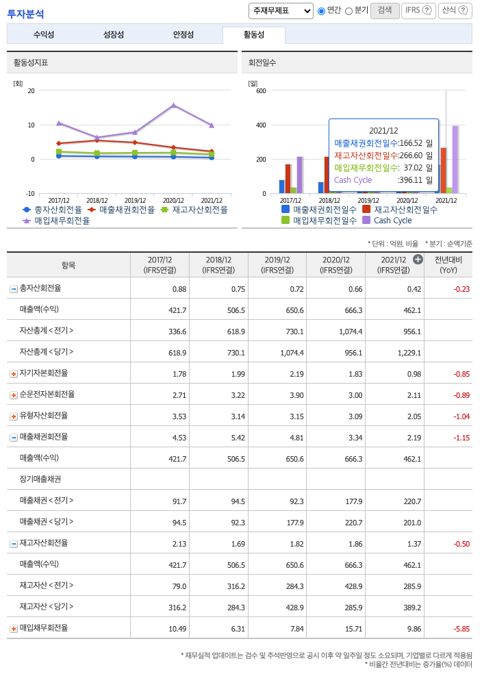재고자산회전율(높을 수록 좋습니다) : 2019년 약 428억원, 2020년 약 285억원, 2021년 약 389억원이고, 회전율은 2019년 약 1%, 2020년 약 1%, 2021년 약 1%로 안정적입니다.