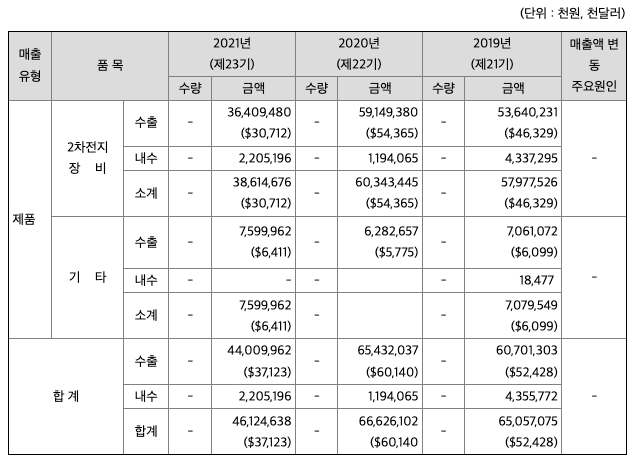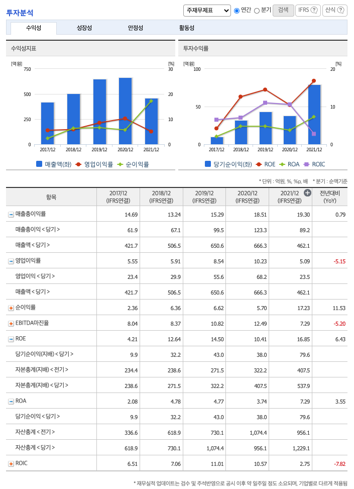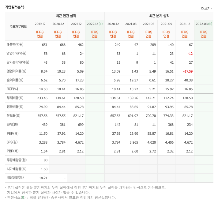 매출액 : 2018년 506억원, 2019년 651억원, 2020년 666억원, 2021년 462억원으로 전년동기대비 감소하였습니다. 2021년는 전년동기대비 -30.6% 감소하였습니다. 2021년 분기별로 보면 1분기 47억원, 2분기 209억원, 3분기 140억원, 4분기 67억원입니다.