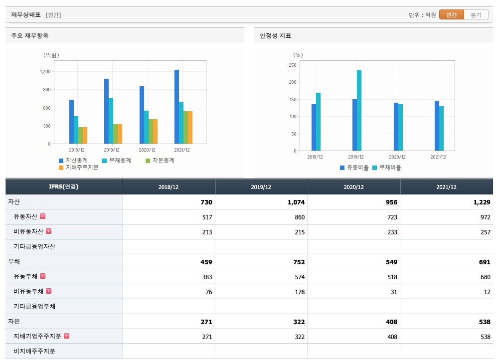 부채비율 : 2019년 약 233%, 2020년 약 134%, 2021년 약 128%로 하고 있으며, 표준(100%)보다 높아 부채비율이 안정적이지 않습니다.