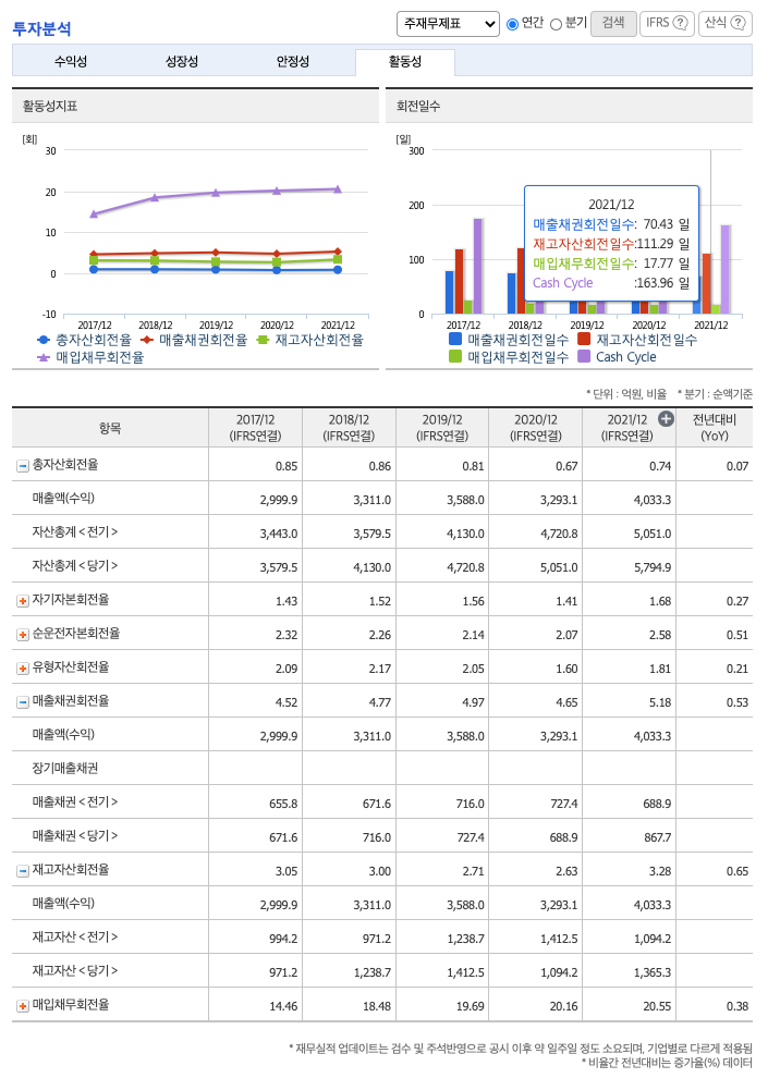 총자산회전율 : 2019년 약 4720억원, 2020년 약 5051억원, 2021년 약 5794억원이고, 회전율은 2019년 약 0.81%, 2020년 약 0.67%, 2021년 약 0.74%로 총자산회전율이 높아지고 있습니다.
